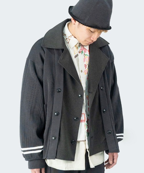 ジャケットにニットカーデガンを羽織った様なレイヤードデザインのニットジャケットです(取り外しは出来ません)。 身頃は厚手のコットンニット素材。 襟前たて部分はウール調に仕上げたポリエステル100%の素材。 袖部分は針抜き柄のコットンニットを使用しております。 ダブルの仕様ですが、シングルとしても着用出来るのでコーディネートの幅が広がるアイテムに仕上げております。 *全て家庭洗いできるイージーケアーの素材をしているので取扱も簡単です。 *マスターキーが提案するジェンダーレス(男女オススメ)な商品です。 *MK25A-K-17 FLEXIBLE RIB-PTとsetupになります。 男性日本人モデル(金髪・眼鏡)185cmがBRN Size FREE着用 男性日本人モデル(黒髪)174cmがBLU Size FREE着用 男性日本人モデル(金髪)173cmがGRY Size FREE着用 外国人男性モデル180cmがGRY Size FREE着用外国人男性モデル180cmがBLU Size FREE着用