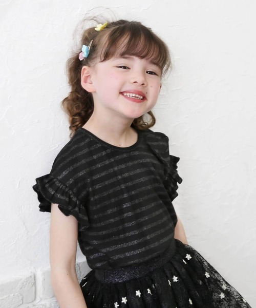 ■モデルサイズ:身長:116cm 体重:19.5kg ■モデルの着用サイズ:110cm 夏の暑さにも、洗濯にも強い、欲しかった一枚が登場です♪ 天然のコットンと実用的なナイロンが融合した生地は、 7:3の割合で、"いいとこ取り"!活発な日々の動きにぴったり! 毎日のお手入れも楽ちんです。 クリームとブラックの選べる2色展開で、大人っぽさと上品さを演出。 シルバーやゴールドのメタルプリントが施されたシンプルなデザインは、 日常にさりげない華やかさを添えます。 片側に添えられたリボンのアクセントは、 ナチュラルながらもキュートな一面を引き立ててくれますね♪ 公園での散歩に、お祭りへのお出かけに、そして毎日の何気ない瞬間にも。 1枚でサッと着られて、着脱も簡単、洗濯も簡単! 快適な夏を過ごせる、ヘビロテ必須の優秀な夏トップスです。 ★STAFF COMMENT★ スタッフの子供が着用してみました♪ ーーーーーーーーーーーーーーーーーーー 【サイズ感】 7歳 / 121cm 22kg / 普通体型/ 普段サイズ:120 120:丁度よい 11歳 / 141cm 33kg / 普通体型 / 普段サイズ:140 140:丁度よい 【透け感】 透け感はありません。 【着心地・素材感】 生地がさらっとしていて涼しい。 さりげない肩リボンとボーダーが可愛い。 ーーーーーーーーーーーーーーーーーーー