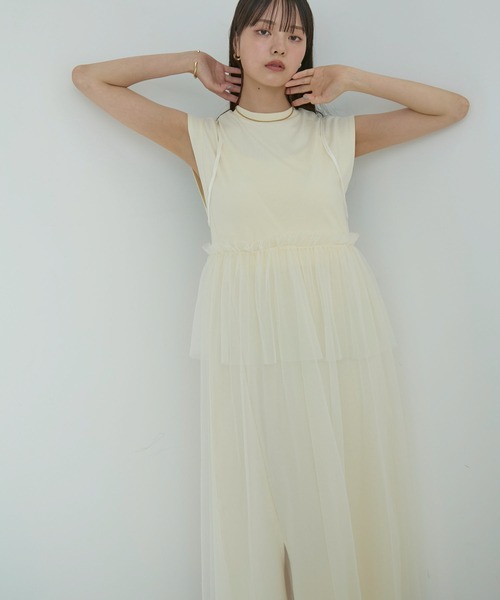 チュールドッキングで軽さのあるシアー感・レイヤード感が出せる夏のワンピース◆2024春夏◆【デザイン・シルエット】 裏毛カットソーとトレンドのチュールをドッキングしたワンピース。 <POINT>・柔らかいチュールで肌に触れてもチクチクせず華やかな印象に。・カットソーでリラックス感がありつつ、カジュアルになりすぎないスタイリングが決まるアイテム。・サイドスリットが足捌きもよく、さりげない肌見せも◎ 【素材】 カットワンピースは綿素材のため、柔らかく暑い夏にもおすすめです。 【カラー】col.15→カットワンピ・チュール共にライトグレー寄りのカラー。col.16→黄色味のあるオフホワイトワンピにはホワイトチュール。col.01→カットワンピ・チュール共にブラック系。 【おすすめのスタイリング】1枚でワンピースとしてはもちろん、デニムとのレイヤードも相性がいいです。 スニーカーやキャップでコーディネートするのもおすすめ。 ----------------------------- 裏地:なし 光沢感:なし 透け感:なし 伸縮性:カットワンピースあり ウエスト:ゴムなし ポケット:なし ボタン:なし 生地の厚さ:普通 肩紐:調整可(チュールキャミ部分) その他仕様:チュールとカットソーのドッキング 季節:春、夏、初秋 ----------------------------- 【モデル着用サイズ】 全色モデル身長:163cm、着用サイズ:F ※画像の商品はサンプルです。 実際の商品と仕様、加工、サイズが若干異なる場合がございます。 ※重量はサンプルFサイズの測量になります。サイズによって多少異なる場合があります。 ※画像によっては実際の色味と異なる場合があります。正しい色味は生地アップ画像をご確認ください。