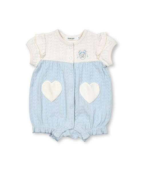ハートがいっぱいのキュートな半袖ロンパース。 身生地に女の子が大好きなハート柄の生地を使用してシンプルになりがちなロンパースの可愛さアップ! ハートモチーフのポケットもオンしてハートいっぱいで女の子がときめくアイテムに仕上げました。 スナップボタンで全開になるので、首が座る前の赤ちゃんに着せやすく、新米ママにもおすすめ! 股下にもスナップが付いていて、足をバタバタしてもはだけにくく、オムツ替えもラクラクな設計になっています。 おねえちゃんサイズのレギンス(1809-62578)でも同じ生地を使用しているのでお揃いコーデも◎ 女の子らしいピンクとさわやかなブルーの2色展開です。 ※腰ポケットあり。 ※柄の出方は生地の裁断により一点一点異なります。 ※バスト寸法は、多少の誤差が生じる事がございます。あらかじめご了承下さい。 2024年春夏女の子アイテム。 【SLAP SLIP(スラップ スリップ)】 ~子どもの欲しいをカタチに~ ヨーロッパのこどものように 子どもらしい今しか着れないナチュラルなかわいさを提案 どこか上品で清楚感漂うフレンチカジュアルは いつものコーディネートをさりげなく格上げ
