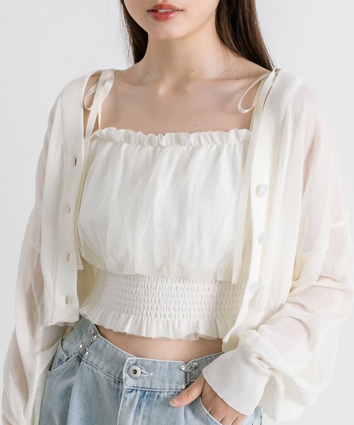 バレエコアコーデにぴったりなキャミソール ■デザイン ・チュールでコーデをトレンドライクに仕上げてくれるカップ付きのキャミソール。 ・肩紐には取り外し可能なリボンが付いていて可愛いデザインです。 ・裾が太めのシャーリングになっているので、ウエスト細見えが期待できます。 ・普段のキャミソールをこれに変えると華やかさがプラスされます。 ・肩紐にアジャスターがあるので、どなたでもちょうどよいフィット感で着れます。 ■カラー ・オフ/チャコール/ブラックの3色展開 ■スタイリング ・カーディガンやシアーシャツとのレイヤードコーデに最適。 ・カップ付きなので1枚でも着用していただけます。 ・ボトムスはガーリーなミニスカートや、カジュアルなパンツまで幅広く合わせていただけます。 ----------------------------- 裏地:あり 光沢感:なし 透け感:なし 伸縮性:なし カップ取り外し: 不可 手洗い: 可能 タンブラー乾燥:不可 アイロン: 不可 ----------------------------- model:オフ・ブラック166cm チャコール162cm ■お気に入り登録のおすすめ 【気になるアイテムを登録】 ハートをクリックしてお気に入りに登録すると 完売カラーの再入荷やラスト1点の通知、セールの通知を受けとることができます。 【ブランドを登録】 新商品や再入荷、セール通知など、いち早くブランドの情報を受けとることができます。
