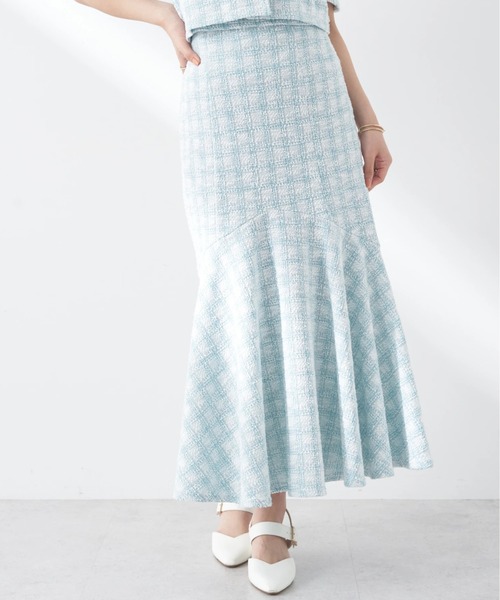 \雑誌『美人百花6月号』P.109掲載/ 裾に向かって広がるマーメイドシルエットが女性らしさを引き立たせるスカート。 表面感のあるツイード生地で仕立てられ、上品な印象を演出します。 バックのウエストはゴム仕様になっているのもポイント◎ トップスをタックインしたメリハリのあるコーディネートがおすすめです。 透け感[無し] 裏地[すべて有り] 伸縮性[有り] 光沢感[無し]※ラメ有り 生地の厚さ[普通] 付属品[無し] ポケット[無し] ●製品寸法: S:ウエスト(後ゴム仕様)62~ ヒップ93 総丈86.5 裾幅165 M:ウエスト(後ゴム仕様)66~ ヒップ97 総丈88 裾幅167 備考: