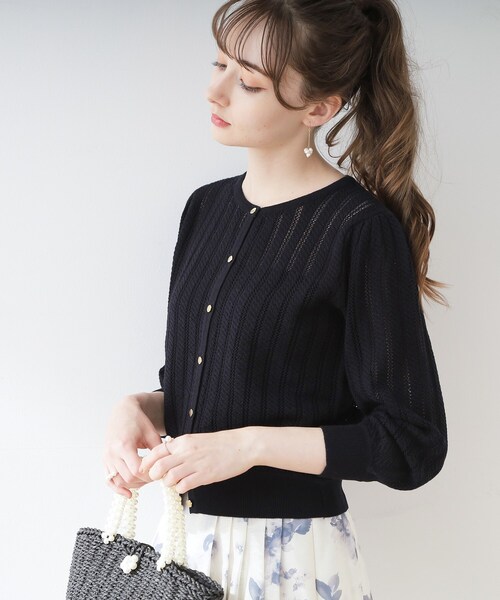 【デザイン】 透かし編みがポイントのニットカーディガンです。 金属調のゴールド/シルバー釦がきらっと輝き上品です。 コンパクトめなシルエットでスカートやワンピースに合わせやすいデザインです。 【素材】 強撚のさらっとした綿混の糸を使用。 編み地はケーブル編みと透かし編みを交互に入れたストライプ調の編み地です。 ※照明の関係により、実際よりも色味が違って見える場合があります。また、パソコン・スマートフォンなどの環境により、若干製品と画像のカラーが異なる場合もございます。 モデル情報:身長167cm B80 W59 H82 着用サイズ:38(M) 店舗へのお問い合わせ商品番号:508-38009 ●製品寸法: 38(M):着丈48cm B91cm 袖丈50cm 肩幅34cm 42(LL):着丈50cm B99cm 袖丈52cm 肩幅36cm 備考:
