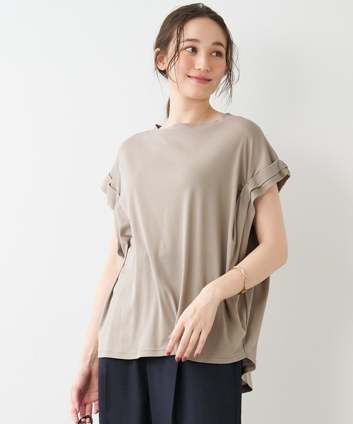 肌に優しいコットンを強撚仕上げにし、サラッと涼しげな風合いのフライスです。汗を吸い肌に馴染むコットンを強撚にすることで肌離れが良く、暑い季節でも快適に過ごせる接触冷感素材です。袖口に重なったタックが入り、自然にニュアンスの出るデザインになっております。また、後ろ身頃にもインバーデットタックが入っており、さりげないデザインが小洒落た雰囲気をかもし出します。カットソーで楽ちんでありながらもブラウス感覚で着れる夏に活躍する1枚です。 水洗い可 素材特性:接触冷感 *詳しくは商品の洗濯表示にてご確認をお願い致します。 *商品画像はできる限り実物の色に近づけるよう徹底しておりますが、お使いのデバイスのモニター設定、お部屋の照明等の閲覧環境により実際の色味と異なって見える場合がございます。*画像の商品はサンプルです。実際の商品と仕様、加工が若干異なる場合があります。予めご了承くださいませ。