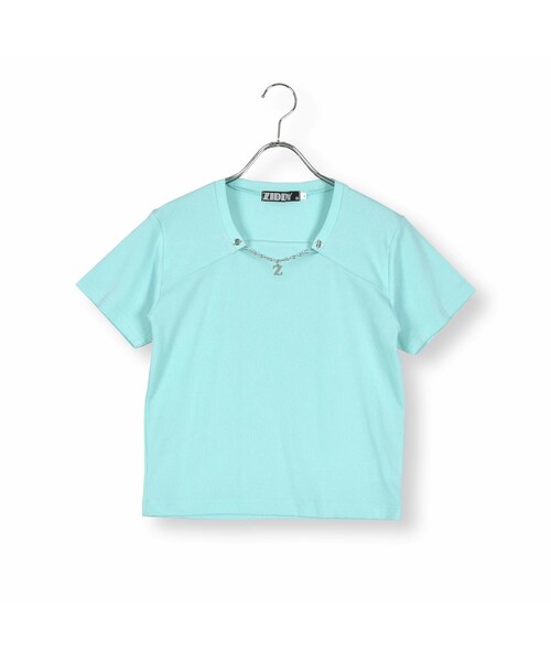 取り外しのできるチャームが胸元に付いたテレコ素材のTシャツです。 身生地はデコボコとした畝(うね)のような模様が特徴的な、横方向への伸縮性が体に程よくフィットするリブ素材です。 胸元をスクエアに開けてチェーンデザインをプラスしたデザインが綺麗で、高見えするアイテムです。 カラーはどんなカラーとも相性抜群でオールラウンドコーデが可能なブラックと、空や海を連想させるブルーの2色です。 ガーリーにもクールにもコーディネート次第で幅広いスタイリングが楽しめます。 シンプルなデザインで合わせやすい、この夏“推し”の一着です! 【ZIDDY(ジディー)】 FOR FASHIONABLE GIRLS ~オシャレが好きな女の子を応援~ レディース・ティーンズトレンドを取り入れた、女の子の“今”に寄り添うファッションブランド ティーンズ心ときめく要素を詰め込んだ商品を展開