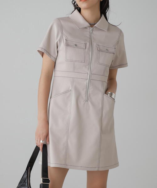 [Fabric&Design]マットな合繊ツイルのシャツミニワンピース。フロントはトレンドのジップ使いで辛さをプラス。胸元のポケットは縦の切り替え、配色ステッチなどワークディティールをミックスさせました。ウエストは程よいシェイプ感でスカート部分も広がりすぎないタイトシルエットにしているのでスタイルアップして見えます。[Styling]足元の合わせはソックスにポインテッドトゥ合わせが今年らしくておすすめ◎シアーインナーをレイヤードしても◎model:骨格ストレート---------------------------------------------------◆商品のお気に入り登録◆お気に入りアイテムの値下げ・再入荷・在庫1点などの通知を受け取ることができます。◆ブランドのお気に入り登録◆新商品や再入荷、セール、クーポン配布などお得な情報を受け取ることができます。---------------------------------------------------※ご注文いただいた予約商品のお届け時期の確認は、注文履歴ページより行えます。