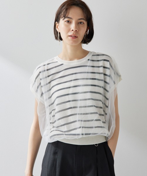【2024SS】 レイヤード見えがポイントのフレンチスリーブニット ■ニットにチュールを重ねたノースリーブニットプルオーバー。 ■レーヨンナイロンの涼しいタッチのニットを使用した一枚。 ■チュールの膨らんだシルエットがフェミニンな印象をプラス。 ■気になる二の腕をカバーできる絶妙な袖の長さも魅力。 ■カジュアルにもきれいめにも合わせやすい着回しの効くアイテム。 ※チュール部分はシワ加工を施した生地を使用しており、その特性上若干の個体差があります。予めご了承ください。 【COLOR】 オフホワイト:カジュアル見えを抑えた上品なボーダー×ホワイト。 ブラック:シックながら軽やかさもあるブラック×ブラック。 ---------------------------------------------------- 洗濯方法:手洗い可 透け感:ややあり 裏地:なし 伸縮性:ニット部分のみあり 光沢感:なし ---------------------------------------------------- ― THE PAUSE(ザ ポーズ) ― 流行を自分らしい発想で切り取ってコーディネートを遊ぶ。 色のグラデーション、ヴィンテージ感漂うワークアイテム・・・ ギャラリーのようなクローゼットの中から 組み合わせをデザインするようにファッションを楽しむ。 そんな、自由なライフスタイルをもつ大人の女性にむけて 新しい感覚のカジュアルスタイルを提案します。 ※画像の商品はサンプルです。実際の商品と仕様、色味が若干異なる場合があります。 また 、パソコンやスマートフォンのモニター環境などにより、色味が違って見える場合がございます。予めご了承ください。 ※店頭及び屋外での撮影画像は、光の当たり具合で色味が違って見える場合があります。商品の色味は、スタジオ撮影の画像をご参照ください。 ※入荷状況によりお届け予定が前後する場合があります。予めご了承ください。 【 気になるアイテムは、「お気に入り」登録を】 ♡マークをクリックしておくことで、スムーズにお買い物が楽しめます。 ・ラスト一点のお知らせ ・再入荷のお知らせ ・SALEのご案内