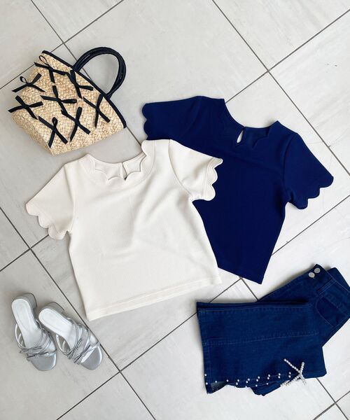 1枚で着映え間違いなし!Tシャツ以上ブラウス未満の万能トップス。 スカラップが目を惹くデザインTシャツ ■デザイン フェミニンなスカラップデザインを衿ぐりと袖に取り入れたTシャツ。 ぽこぽこした表面感のソフトなジャガードカットソーで仕立て、カジュアルな中にも品のあるトップスに。 首まわりはインナーが見えないよう程よく開け、1枚で着やすいデザインにこだわりました。シワになりにくいのもポイント♪ ■サイズ感 ボトムにインできるちょうどいい丈感です。 程よくゆとりのあるサイズ感で、ストレスフリーな着心地◎ ■スタイリング レディな印象のトップスなので、フレアやマーメイドなどのスカートとの相性抜群です。 特に1037046348 バックレースアップひざ丈スカート とのコーディネートがおすすめ◎ トレンドのデニムアイテムとあわせたカジュアルミックスコーデにもぴったりです。ON/OFF問わず大活躍間違いなしの優秀トップスです。 ・・・・・・・・・・・・・・・・・・・・・・ 透け感:ややあり(アイボリー) 裏地:なし 伸縮性:あり 光沢感:なし 生地の厚さ:普通 ・・・・・・・・・・・・・・・・・・・・・・ ■商品のお気に入り登録 再入荷通知やのこりわずか、お得なプライスダウンの情報も受け取ることができます。 ぜひご登録ください◎ ※サンプルでの撮影の為、製品と仕様が異なる場合がございます。 ※こちらの商品はWEB限定販売商品となっております。