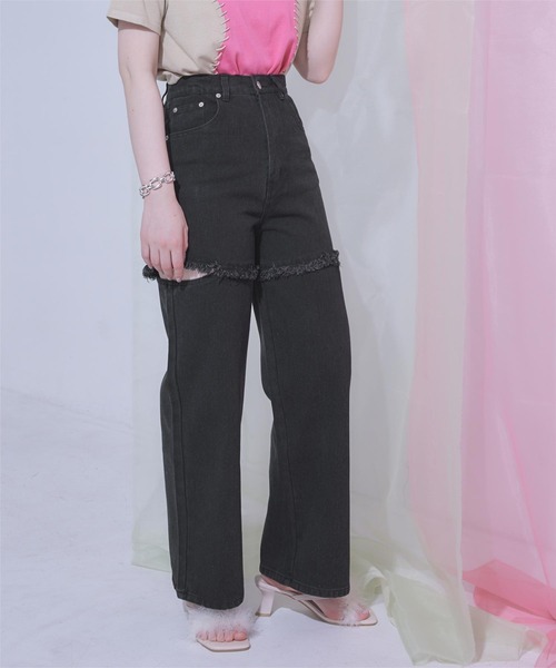 ・両サイドのスリットデザインとダメージ切り替えがポイントのデニム。・ルーズなシルエットで今っぽい旬のスタイリングが完成します。・程良い肌見せで抜け感を演出。※当商品は機械による生産の過程上、どうしても"生地を織る際の糸の継ぎ目"や多少の"ほつれ"、他繊維の"混紡"、また、形やサイズや柄に多少の"誤差"が生じる場合がございます。※サイズは、実寸サイズを測っているため多少誤差がでる場合があります。製造工程の関係上、各採寸箇所実寸(平置き)より【約-3cm~+3cm】程度は誤差の許容範囲とさせて頂いておりますので、予めご了承くださいませ。※メーカーより密封状態で入庫し、検品時に再度袋詰めを行っておりますが、素材により染料等の臭いが強い場合がございます。※発送上の状態によって商品がシワになる場合がございます。※商品により色落ち・色移りがある場合がございますので、品質表示をご確認の上、お取り扱いにご注意くださいませ。【伸縮性】斜め方向に多少あり【透け感】なし