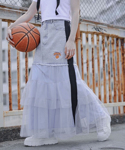【ポイント】 ・サイドラインでスポーツテイストを取り入れた今年らしいデザイン! ・トレンドのチュール素材と春夏に欠かせないデニムのドッキングスカート ・NBAチームのロゴ刺繍がワンポイントに! ・ウエストは一部ゴム仕様になっているので楽な穿き心地◎ ・フリルチュールで程よく甘さもプラス! ・脚回りはチュールで軽やかに、腰回りはすっきりと見せてくれます◎ 【素材】 適度に厚みのあるコットン仕立てで肌触りが良く、通気性・吸湿性・耐久性に優れたデニム生地。 さらっと軽いチュール素材は程よい透け感で今年らしい印象に見せてくれます。 チュール部分にはインナーを付けているので肌見せしすぎず、年齢を問わず着用いただけます。 ーーー 【スタイリング】 取り入れるだけでスタイリングの主役になるデザインスカートなのでシンプルなTシャツ等でもしっかりと決まります。 トラックジャケット等のスポーツテイストのアイテムを合わせるのはもちろん、あえてクリーンなシャツやヒールサンダルと合わせて女性らしい着こなしにするのもおすすめです。 【NBA】ナショナル・バスケットボール・アソシエーション(英語:National Basketball Association) 1946年に創設された北米大陸を拠点とするプロバスケットボールリーグ。 アメリカ合衆国の29チームおよびカナダの1チームの計30チームからなる。