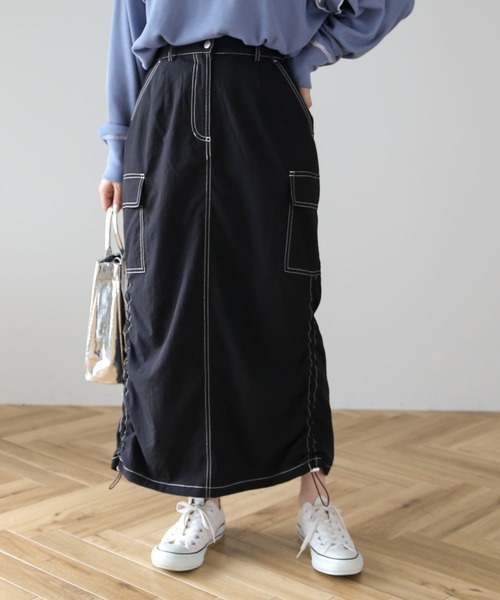 配色ステッチがアクセントをプラスするカーゴスカート。 タイトなIラインシルエットでスマートにスタイリング出来るのも嬉しいポイント。 サイドのドロストを絞れば、シルエットの変化も楽しむことができます。 こなれ感のあるトレンドライクなスタイリングが楽しめる1着です。 透け感[無し] 裏地[一部有り]※グリーン・ブラック無し 伸縮性[無し] 光沢感[無し] 生地の厚さ[薄手] 付属品[無し] ポケット[有り]前2つ 後2つ ●製品寸法: F:ウエスト[後ゴム仕様]62cm ヒップ100cm 総丈88cm 備考: