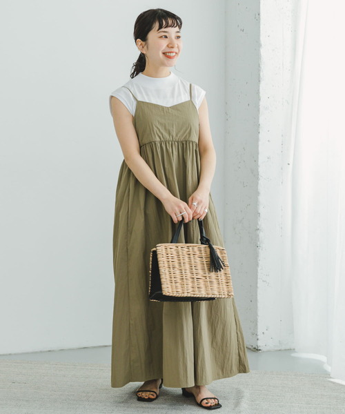 シワ感のある表情でナチュラルな風合いに仕立てたキャミワンピースとシンプルなホワイトカラーのフレンチスリーブTシャツのセット。Aラインに広がるシルエットのワンピースは、胸下に切り替えデザインを加えることでボリュームシルエットながら着ぶくれせずスタイルアップ効果を発揮。肩ストラップにアジャスターを施しているので着丈のサイズ調整が可能なのも嬉しいポイントです♪【2024 Spring/Summer】【24SS】重量(ワンピース) : 約210g[トップス]one : 肩幅44cm / 総丈60cm / 身幅50cm※商品画像は、光の当たり具合やパソコンなどの閲覧環境により、実際の色味と異なって見える場合がございます。予めご了承ください。※商品の色味の目安は、商品単体の画像をご参照ください。▼お気に入り登録のおすすめ▼お気に入り登録商品は、マイページにて現在の価格情報や在庫状況の確認が可能です。お買い物リストの管理に是非ご利用下さい。素材感透け感 : ややあり(トップスのみ)伸縮性 : あり(トップスのみ)裏地 : なし光沢 : なしポケット : なし