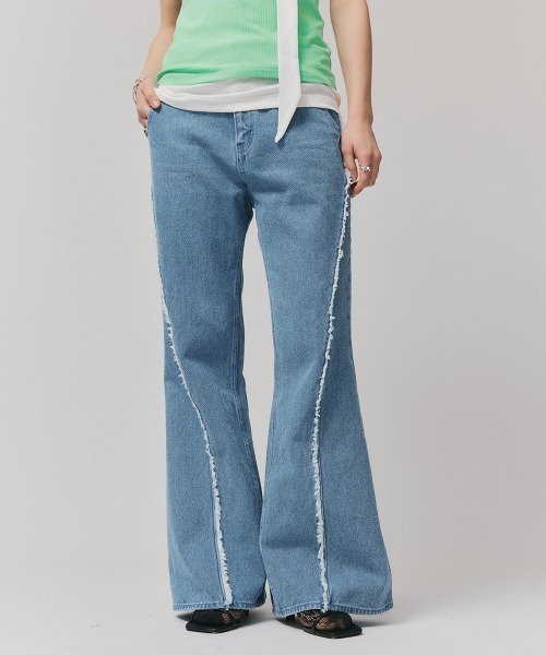 <Fabric> 程よい厚みのあるタフさを兼ね備えたコットン100%のデニム生地を使用。 <Style> 裾に向かって広がるセミフレアのシルエットのデニムパンツ。 サイドに施したフリンジデザインが特徴です。 どちらも夏に履きたくなる爽やかなカラーにいたしました。 スタイルアップ効果が抜群で、どんなスタイルにもアイテムにも合わせやすいデニムパンツです。 膝から上はシュッとしたシルエットなので、トレンドのスカートレイヤードスタイルにもおすすめです。 【led.tokyo/レッドトーキョー】 TOKYOから生まれるファッション・アート・ 音楽・映画・漫画をはじめとした様々なカルチャーからのインスピレーションをコレクションに落とし込んでいます。 TOKYO的なファッション・カルチャーの ミックスアップ・編集感覚はそれぞれのアイテムに落とし込まれ、様々なスタイリングを生み出すことができます。 袖が取り外せたり、前・後ろで着られたり、 ひとつのアイテムから様々な着こなし、無限のスタイリングアイディアが生まれます。 ブランドが考えるルックブック的なスタイルではなく、着る人それぞれが自分だけのスタイルを生み出していく。 それが『led.tokyo』の考えです。 【お買い物をよりお楽しみいただくために】 ■商品のお気に入り登録(ハートマークをクリック) 完売カラーの再入荷通知や、在庫ラスト1点の通知、セールの通知を受け取ることができます。 ■ブランドのお気に入り登録 新商品がUPされたり売り切れ商品が再入荷したときなど、いち早くブランドのお得な情報を受け取ることができます。 是非ご利用頂き、お買い物をお楽しみください。