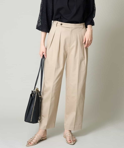 ◆カジュアルにもきれいめにも合わせやすいチノパンツ◆ 【デザイン】 ・トレンドアイテムでもある大人チノパンツ ・細すぎないテーパードシルエットで綺麗めでも着こなしやすいシルエット ・2タックで気になるお腹周りをカバー ・ベーシックなベージュカラーで合わせやすさ◎ ・フロントとバックウエストはすっきり、サイドゴムで楽な穿き心地 【素材】 ・ご自宅の洗濯機で洗えます ・コットン入りでさらっとした履き心地 【コーディネート】 春夏らしいカラートップスや ボーダーのカットソー合わせがおすすめです。 カジュアル過ぎないのできれいめなブラウスや レーストップス合わせも◎ -------------------- 透け感:なし 裏地:なし 伸縮性:ややあり 光沢感:なし 生地の厚さ:ふつう -------------------- ≪お気に入り登録機能の使い方≫ ■商品のお気に入り登録(ハートマークをクリック) 再入荷通知や値下げ等、お得なご案内を受けることができます。 -------------------- ※商品画像は、光の当たり具合やパソコンなどの閲覧環境により 実際の色味と異なって見える場合がございます。 商品の色味の目安は商品単体の画像をご参照ください。 ※34(XSサイズ)・42(XLサイズ)はWEB・一部限定店舗での販売です。