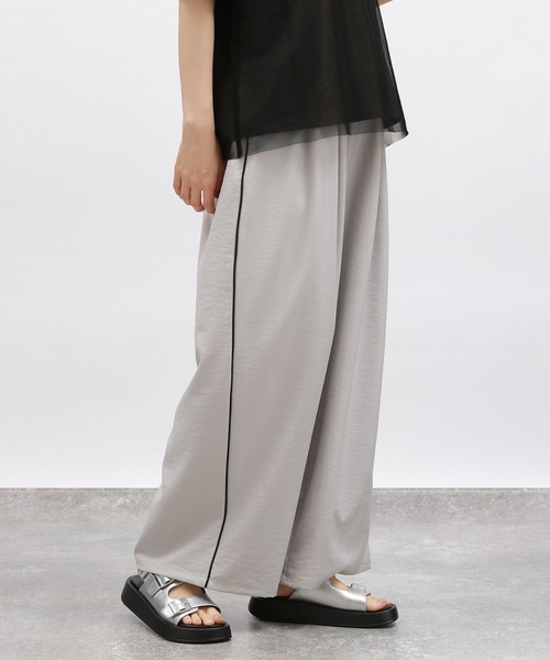 サイドのさりげないパイピングラインがアクセントになったパンツ。 ウエストがゴム仕様で着脱が楽な1本です。 ギャザーデザインでほどよいゆとりがあり、少しワイドなシルエットはリラックス感もあり〇 アイボリーのみ裏地が付き、透け感気にせずお穿きいただけます。 【素材】 肌に触れた瞬間にひんやりとした感覚を得られ、爽やかに着用いただける接触冷感生地使用。 【スタイリング】 スポーティーな印象なのでガーリーなシアー、チュールアイテムとのスタイリングがおすすめ。