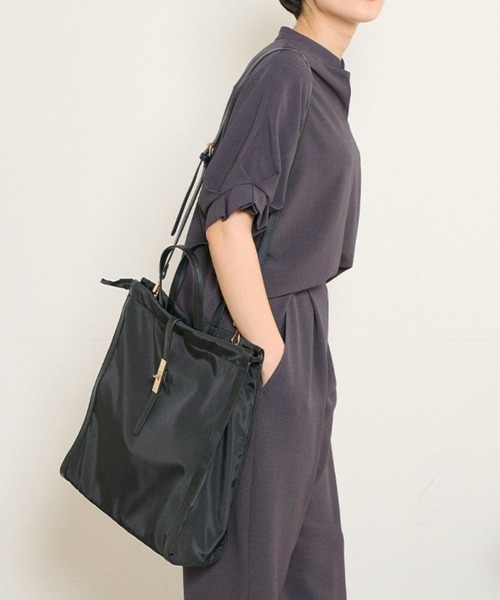 大容量ながらすっきりとクリーンな印象のトートバッグ。革のパイピングがアクセントになり、きれいめな印象をプラスします。サイドポケットに加えて内ポケットが2つあり、サイドの紐を絞れば巾着状にもできて機能性抜群。付属のベルトで斜め掛けとしても使えるので、シーンや荷物の量で使い分けられる優秀デザインです。 ・A4収納可 ・ベルト調整可(90cm~110cm)