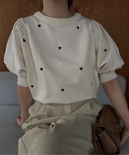 【ハートフルパフスリーブサマーニット】・大人気シリーズ、配色ハート刺繍の半袖パスフリーブニット・主役級『大人可愛いニット』がこれからの季節大活躍・程よいハートの大きさで、こなれた印象に魅せてくれます・ややハリ感のあるしっかりとした生地感で長くお召しいただけます・程よいサイズ感なのでお手持ちのボトムスを合わせても相性抜群◎透け感:なし 伸縮性:あり