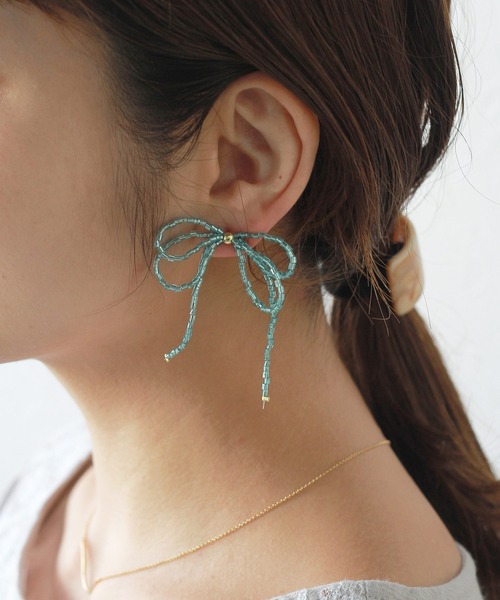 耳元で揺れるビーズが目を惹くピアス。リボンモチーフのデザインでトレンド感のある大人かわいい雰囲気に。繊細で華奢なディテールで存在感があり、顔周りに華やかさをプラスしてくれます。大きめのサイズ感ですがビーズで作られているので軽い印象に。デイリー使いしやすく明るいカラーがコーディネートのアクセントになります。※ サンプル商品で撮影をしております。生産時の生地のロット違いによる色の差が生じる場合もございます。不良品ではございませんのでご了承くださいませ。ご不安のある方、ご理解いただけない方に関しましては、大変心苦しい限りではございますがご購入をご遠慮いただけますようお願いいたします。