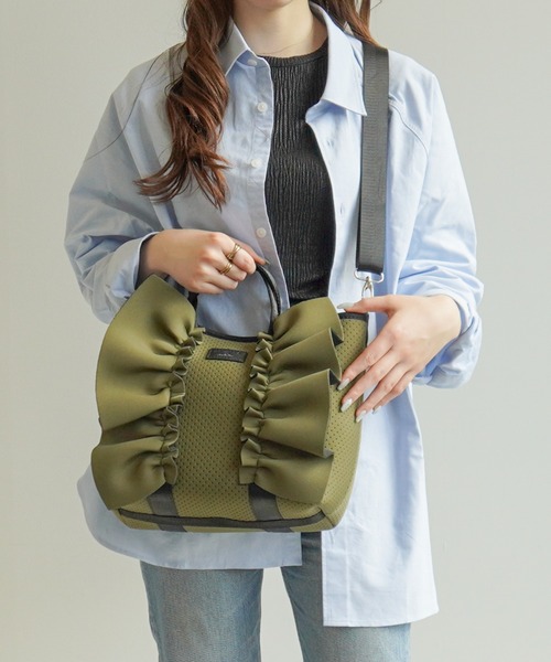 【おすすめポイント】・軽量な「ネオプレン」素材ハンドバッグ・正面のフリルでカジュアルアイテムもフェミニンに・着脱可能なショルダーベルト付き軽くて丈夫な「ネオプレン」を使用したハンドバッグ。カジュアル感のある素材ながら、フロントにフリルをあしらうことでフェミニンさもプラス。柔らかく、厚みのある素材なので立体感のあるシルエットに。着脱可能なショルダーベルトが付属しているのでハンドバッグとショルダーバッグの2WAYでご使用いただけます。マグネットで開閉できるので急いでいるときにも便利です。※素材の特性上ウエットスーツなどにもみられるシワが見られる場合がございますがご了承ください。【内装ポケット】・釣りベタポケット×1・釣りファスナーポケット×1※おしらせ※商品の画像は展示会時のものを使用しており、実際の商品と仕様や色味が若干異なる場合がございます。ご覧いただいているモニターによっても実際の色と多少異なる場合があります。また、予告なく仕様変更する場合がございますのでご了承下さいませ。