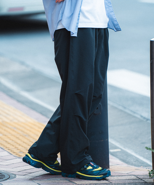 ”爽やかな肌触りとトレンドのシルエットを併せ持つ一押しワイドパンツ” 細かいシボ、畝のポリエステルサッカー生地を採用しています。薄手でサラッとした着用感は快適な着心地を実現します。 ゆったりとしたシルエットで取り入れるだけでシルエットにメリハリを与えます。裾の紐でシルエット、ボリュームに変化をつけられる仕様です。 併せるトップスやシューズ選びも楽しい、おすすめの一着です。 ---24SS シアサッカーコレクション--- 24030312521020 サッカーワイドイージー 24051312507020 サッカーオープンカラーシャツ 24031312506020 サッカーショーツ