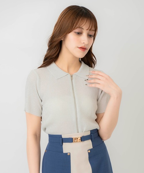 ラメ混の糸を使用したポロ襟タイプのジップアップニット 襟付きのサマーニットなので、きちんと感もプラスしてくれます。 ジップアップのデザインでトレンド感のある1着に仕上げました。 シンプルな色味なので多色買いでコーディネートのプラスワンに大活躍。 【styling】 シンプルなニットなので、どんなコーディネートとも相性は抜群。 フェミニン要素のあるスカート合わせでキレイめなコーディネートや、ハイウエストなパンツにインしてカジュアルな要素を演出しても◎ ノーカラージャケットや羽織のインナーとしても使えるので、ロングシーズン活躍できます。 -------------------------- 透け感:なし 裏地:なし 伸縮性:あり 生地の厚さ:普通 --------------------------- F:着丈41cm バスト76cm 肩幅33cm 袖丈19cm
