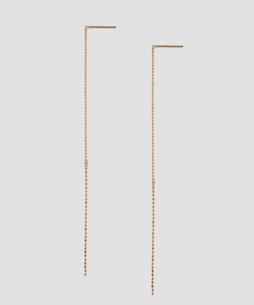 K10ゴールドのボールチェーンが揺れる、アメリカンピアスです。水滴がつらなった、水紋のような印象で顔周りを上品に彩ります。球体ではなく少しほっそりとしたオーバル型のボールが連なったチェーンは粒の一つ一つにカットが施されているため、動くたびにカット面がきらきらと輝きます。シンプルで飽きのこないデザインはシーンを選ばずお使いいただけます。さりげない存在感ながらK10ゴールドのシャープな輝きと揺れ動くデザインは印象的なスタイリングに。ホールに細いチェーン部分を全部通して使ったり、ポスト部分のみを通してキャッチで留めたりと長さを調整してお使いいただけます。装いに合わせてフォルムを変化させて楽しんで。おそろいのチェーンを使った、ネックレスやリングとのコーディネートもおすすめです。【Ray/レイ】どんなお洋服にも合わせやすく、重ね付けをすることによりジュエリーを身近に楽しんでいただけます。
