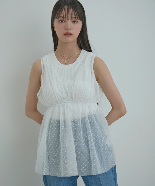 同色のフロッキードットで程よく華やかなチュールのレイヤードアイテム◆2024春夏◆ 【デザイン・シルエット】 ウエストシャーリングとフロッキードット生地がデザインポイントになっており、デザイン性が高いアイテム <POINT> ・いつものコーディネートに合わせるだけで一気にトレンド感がプラスされる1枚。 ・胸下のギャザー切り替えはゴム使用。 ・甘さを抑えたチュール素材のフロッキードットが着映え抜群なブラウス。 【素材】 チュール地に同色のフロッキードットが施された今年らしい素材感 【カラー】 ブラック・ホワイト・ブラウンの3色展開 【おすすめのスタイリング】 チュニック丈なのでパンツスタイルがおすすめ。 真夏に向けては、Tシャツ・タンクトップ・キャミとレイヤードしても涼しげに着用いただけます。 ----------------------------- 裏地:なし 光沢感:ややあり 透け感:あり 伸縮性:なし ウエスト:一部ゴム(胸下切り替え部分) 生地の厚さ:薄手 季節:通年 ----------------------------- 【モデル着用サイズ】 全色モデル身長:163cm、詳細モデル身長:160cm ※画像の商品はサンプルです。 実際の商品と仕様、加工、サイズが若干異なる場合がございます。 ※重量はサンプルMサイズの測量になります。サイズによって多少異なる場合があります。 ※画像によっては実際の色味と異なる場合があります。正しい色味は生地アップ画像をご確認ください。