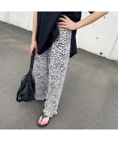 一枚で大人っぽい印象のダルメシアン柄パンツが登場! ワイドでも広がりすぎずさりげなく足のラインに沿うようなシルエットと 細やかな縦ラインのプリーツ加工で美脚効果を演出♪ 裾はフリルのように波を打ったメロー加工で、動くたびにひらひらと揺れ、抜け感をプラスしてくれます。 伸縮性があり動きやすい生地感が快適!ウエストゴムなのでお腹周りも楽ちんです。 シンプルな無地トップスに合わせてコーデの主役になる1本です。 ※モデル身長:161㎝ ◾️カラー ホワイト(オフ×ブラック) ■サイズ M:総丈96cm ウエスト33cm(総ゴム) 股下65cm 裾幅26cm ■素材 ポリエステル100% 裏地なし