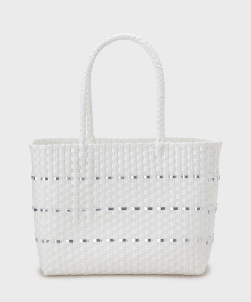【My style is...掲載】トレンドのメタリックカラーがポイントのメルカドバッグ・プラスチックテープを編み上げたトートバッグ・トレンドのメタリックカラーのテープが効いた高見えデザイン・底マチがたっぷりで見た目以上の収納力【デザイン】スペイン語で市場を表す意味の「メルカド」底マチたっぷりで見た目以上に収納力のある大容量バッグをご用意しました。ベーシックカラーの本体にメタリックカラーのテープがデザインポイントです。#003オフホワイトにはシルバー、#019ブラックにはゴールドのポイントカラーが効いています。涼し気な印象で、メタリックのポイントカラーが高見えな印象です。普段使いだけでなく、ビーチや公園など春夏のお出かけシーンにもおすすめのアイテムです。ご自身でお持ちのポーチや巾着、スカーフなどを組み合わせてアレンジしてお持ちいただくのもおすすめです。※照明の関係により、実際よりも色味が違って見える場合があります。また、パソコン・スマートフォンなどの環境により、若干製品と画像のカラーが異なる場合もございます。店舗へのお問い合わせ商品番号:C71-18066●製品寸法:00:高さ21cm 幅(上部)31cm 幅(下部)25cm マチ12cm 持ち手上がり16.5cm備考:重量:約275g
