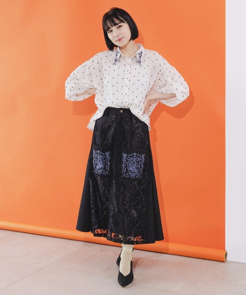 + iS ScoLar商品 +まるで衿に蝶々がとまっているかのような、蝶刺繍がアクセントになったシアーシャツ。ほんのり上品な透け感とふわっとした女性らしいシルエットが楽しめる一枚です。カラーによって使用している生地が異なり、05(アイボリー)・29(ネイビー)には表面に凹凸のあるドット生地、09(ブラック)・63(パープル)にはほんのりシワ感がナチュラル感のある無地生地を使用。袖口にはゴムが入っているので、袖をたくし上げてふんわり五分袖にしてもカワイイですよ♪■スタイリングitemはコチラ⇒【542201】●model:ななせ 155㎝●model着用:05(アイボリー)(着用商品はサンプルの為、実際のデザインと変更がある場合がございます)ーーーーー裏地:なし透け感:透け感あり生地の厚さ:やや薄手生地感:なめらか伸縮性:なしポケット:なしーーーーー※ 刺繍使用取り扱いのご注意:※この製品は摩擦や水濡れにより色落ちにすることがありますのでご注意ください。※この製品は生地独特な風合いを出すために、製品加工してあります。(製品は1点、1点多少表情が違います)※この商品は糸及び編組織の性質上、引っ掛け・引っ掛かりやすい為、着脱時や取り扱いにご注意下さい。※この商品は刺繍を使用しており、引っ掛け・引っ掛かりやすいデザインの為、着脱時や取り扱いにご注意下さい。※この製品はレーヨン素材を使用しており、縮みやすいのでお洗濯の際にはご注意ください