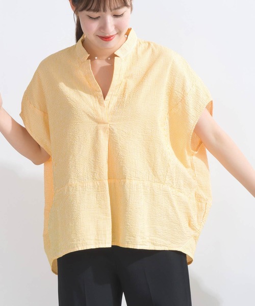 シワになりにくく凸凹感のある表面でサラサラとした肌触りが特徴のシアサッカーを使用したブラウス。丸みのあるコクーンシルエットなので、肌との接地面が少なく清涼感や通気性に優れています。程よい袖の長さと腰回りまである丈感なので体型カバーも叶います。首元はスキッパー開きなので、すっきりとした印象になります。1枚で立体的なシルエットのブラウスなので、ボトムスを選ばず幅広いスタイリングに活躍してくれます。※この製品はインド製の生地を使用しています。織りキズ、染ムラ、多少のプリントずれは商品の特徴として予めご了承お願い致します。【詳細情報】厚み:□薄手 ■ふつう □厚手透け感: ■なし □あり光沢感: ■なし □あり伸縮性: ■なし □あり裏地: ■なし □ありポケット:■なし □あり 重量: 約180g※撮影場所や明るさにより実際の商品と色味が若干異なる場合がございます。 ☆商品のお気に入り♡登録を押せば”再入荷通知”や”残りわずか通知” 値下げのお知らせが届きます!お気に入りのブランド登録していただければ新商品入荷のお知らせも届きますので是非登録してみて下さい