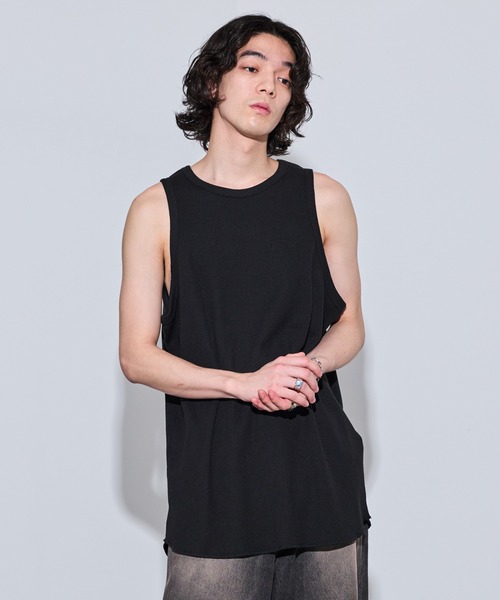 【 マルチに使える 】万能インナー【 素材 】清涼感のあるワッフル素材なので、真夏でもさらっとして快適に過ごせます。薄すぎない肉感なので透け感も気になりません。【 デザイン・シルエット 】一枚でもレイヤードインナーにも使いやすいタンクトップカットソーです。ややロングシルエットになっており裾でのレイヤードも楽しめ、程よい肩幅でレイヤードした時の透けも気にならないアイテムです。【 カラー 】スタイリング取り入れやすい、ホワイトとブラックの2色展開。【 スタイリング 】シンプルになりがちな夏コーデのアクセントとして、アクセサリー感覚でTシャツやシャツのインナーに合わせるスタイルがおすすめです。また一枚着の際は、デザイン性のあるパンツにインしたコーディネートもおすすめです。【 ディテール 】シャツやTシャツとレイヤードした時にもしっかり裾から出る丈に設定しております。【 類似トップスシリーズ 】ANF74010 ルーズタンクトップANF74000 ルーズノースリーブANF73000 ルーズノースリーブカットソーANF71000 ルーズノースリーブカットソー裏地:なし光沢感:なし透け感:なしポケット:なし伸縮性:あり生地の厚さ:普通【 モデル着用サイズ 】MEN:身長180cm 着用サイズL※撮影場所やライティング、お使いのモニター環境によって色の見え方が異なる場合がございます。※商品のカラーは詳細画像の色味をご参照ください。