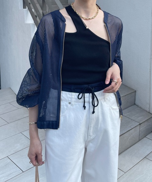 大人のカジュアルスタイルに合わせやすい夏アウター 【POINT】 ・透け感を楽しむコーディネートにオススメなメッシュ素材を使用したブルゾン ・大き目のスクエアメッシュ素材を使用しているので、通気性が良いので夏場でも羽織れます。 ・フロントはジップ仕様、裾にコードを使用しており、着丈の調節やボリューム感の調節をスタイリングに合わせてして頂けます。 ・リラックス感がありつつもバランスが取りやすく、合わせるボトムスを選ばずコーディネートできる万能アウターです。 【おすすめコーディネート】 きれいめコーデと合わせても、デニムやタンクトップのカジュアルスタイルに合わせても◎。 秋口には長袖と合わせてるのもおすすめです。 【素材】 本体:ポリエステル 100% 別布部分:ポリエステル 85% コットン 15% 透け感:あり 裏地:なし 伸縮性:なし 光沢感:なし 洗濯:ご自宅にて手洗い可 【気になる商品は「お気に入り」登録を】 ハートマークをクリックし、お好きなカラーを選んでお気に入りに登録すると 入荷情報や残り1点の通知、完売カラーの再入荷、セール情報などを受け取ることができます。 ※撮影場所やお使いのモニター環境により若干お色味が異なる場合がございます。 特にロケの撮影では明るく見える傾向にございます。詳細撮影画像で色味をお確かめくださいます様お願いいたします。 ※サンプルで撮影をしております。若干の仕様が変更になる場合がございますので予めご了承の上ご注文くださいますようお願いいたします。 ※サンプルでの採寸のためあくまで目安となります。予めご了承ください。