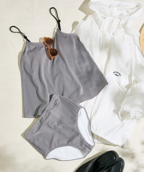 PUAL CE CIN Swimwear 2024 SUMMER ーピュアルセシンが提案する大人女子のためのスイムウェアー ピュアルセシンからスイムウェアが登場! 気になる部分をカバーしつつ細見え効果抜群の縦ストライプスイムウエア <Design> 2点セット キャミソール型のブラトップ/ショーツ 気になる部分をおしゃれにカバーできるキャミソール型の水着です。 キャミソール型のトップスとショーツの2点セット。 トップはカップ内蔵のブラトップ型。 フレア感のあるキャミソールは ひらっと揺れる特別感のあるシルエットでありながらも 気になるおなか部分をカバーしてくれる心強いデザイン水着。 ショーツは細長効果抜群のハイウエストデザインでウエストやヒップ周りもしっかりカバーされます。 脇部分にあるロゴプリントもポイントです。 別売りのショートパンツやマウンテンパーカーを合わせたスタイルもおすすめです。 ワイヤー なし 肩紐 アジャスターあり・取り外し不可 パット あり(取り外し可能) パットポケット あり <Fabric> 伸縮性のあるフラットな表面感の素材です ============================== 透け感:なし 裏地:なし 伸縮性:あり 光沢感:なし 生地の厚さ:普通 【スタッフコメント】 年齢:30代後半/身長:155cm/普段着用サイズ:M~Lサイズ サイズ感:ぴったり着ることが出来ます。窮屈感はありません。 素材感:伸縮性あり ============================== ※着用、お取り扱いの際は、商品についている品質表示とアテンションタグを必ずご確認下さい。 ※撮影場所やお使いのモニター環境により若干お色味が異なる場合がございます。特にロケの撮影では明るく見える傾向にございます。 ※予約商品はサンプルで撮影をしております。若干の仕様が変更になる場合がございますので予めご了承の上ご注文くださいますようお願いいたします 。
