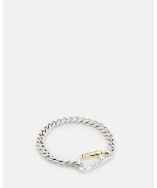 カラビナリンク付きの2色のチェーン。ツートーンのフラットカーブチェーンがクールなデザイン。シグネチャーエングレーブ付き。ステートメントチェーンとオールセインツのメンズジュエリーを重ね付けしよう。 ▼特徴、ポイント ブレスレット カラビナ開閉 ウォームシルバー&ゴールドカラー仕上げ シグネチャーエングレーブ ニッケルフリー オールセインツのポーチ入り ポーチは保管袋兼クリーニングクロスとして使用可能 ジュエリーは変色を防ぐためポーチに保管してください ALLSAINTS(オールセインツ)について 1994年創業の英国発プレミアムコンテンポラリーブランド。イーストロンドンに本社を構え、メンズ・ウィメンズウェアをはじめとする商品のデザインからストアデザインまで、すべてを自社でコントロールしています。アイコンのバイカージャケットを筆頭に、バッグやシューズなどのレザーグッズ、独特なシルエットのドレス、素材にこだわったニットやシャツ、デニムなどの豊富なアイテムが揃います。現在、世界26か国に250店舗以上を展開中。