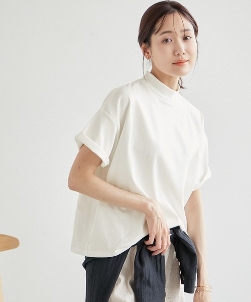 サラッとした着心地◎。首もとの日焼けが気になる人におすすめ。【素材感】 ・汗ばむ時期に嬉しい汗染みを抑える機能素材。 ・ひんやりとした肌触りの接触冷感素材。 【デザイン・シルエット】 ・ややメンズライクなテイストのモックネックTシャツ。 ・身幅や袖幅もたぷりとしたワイドシルエット。 ・ロゴデザインが異なるアソート展開。 【カラー】 ・ブラック(01)グレー系(09):無地 ・オフホワイト(15):バックロゴあり ・キナリ系(17):バックロゴありボーダー <ロゴの意味> oui:はい、そう。などの肯定の意。 ※グレー系(09)はベージュみのあるグレージュのような色味になります。 【スタイリングポイント】 ・たっぷりとしたキャミソールドレスとのレイヤードに。 ・ワイドパンツを合わせてリラクシーなスタイルが完成。 ・カーゴパンツやジョガーパンツ合わせも◎。 ----------------------------- 裏地:なし 透け感:なし 伸縮性:ややあり 生地感・厚さ:普通 季節:夏 ----------------------------- ※撮影時の光、お使いのモニター環境によって色の見え方が違う場合がございます。 ※モデル身長:165cm 着用サイズ:38