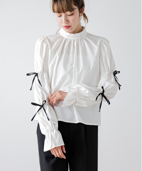 1枚でトレンドライクな着こなしに フレンチガーリーブラウス ネックギャザーのドレープ感と、リボンをあしらった キャンディスリーブデザインが魅力的なブラウス。 1枚で着るのはもちろん、ベストやキャミワンピ、トレンドの ビスチェとのレイヤードスタイルも楽しめます。 大胆に絞った キャンディースリーブデザイン ギャザーで絞られたキャンディー スリーブにリボンのついた 存在感抜群のガーリーなデザイン。 お顔まわりを華やかに すっきりとした印象のスタンドカラーにギャザーを施し、 お顔まわりを華やかに見せてくれます。 ■Fabric お手入れしやすく、柔らかでとろみ感のあるシャツ生地 --------------------- 透け感:ホワイトあり 裏地:なし 厚さ:薄手 伸縮性:なし --------------------- ▼《お気に入り登録》でお得な情報がいっぱい▼ ・「商品のお気に入り登録」で再入荷通知や、ラストの通知、セール通知も受け取ることができます。 ・「ブランドのお気に入り登録」で新商品や再入荷など、お得な情報を受け取ることができます!