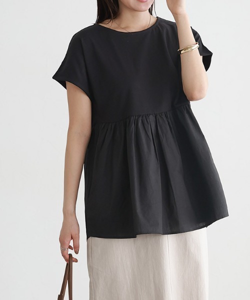 フェミニンで女性らしさ漂う“ドッキングヘムフレンチTシャツ”滑らかな表面感がカジュアルながらも上品な印象に。裾の布帛部分は、綿混素材で程よくハリがあり、綺麗なシルエットをキープしてくれます。ウエストにギャザーを施し、ふんわりとしたシルエットが女性らしく、一枚で着映え感を演出。ウエスト周りの体型カバーになるところも嬉しいポイントです。身頃はふんわりとしたシルエットなので肩はフレンチスリーブで袖もすっきりとしたサイズ感に仕上げました。透け感(淡色):あり透け感(濃色):なし伸縮性:身頃のみあり裏地:なしポケット:なしファスナー:なし生地の特性上少し毛羽たちが生じます。オフホワイトに透け感が生じます。※商品画像は着用イメージです。光や角度により、実物と色味が異なる場合がございます。また表示のサイズ感も実物とは若干異なる場合もございますので、予めご了承ください。【ブランド】marvelous by Pierrot(マーベラスバイピエロ)----------------------------------------------【お買い物を楽しむための方法】**商品のお気に入り登録**カートボタン横の♡をクリック!気になるアイテムが完売しても再入荷のお知らせ通知や、在庫ラスト1点の通知、セールの通知が届きます。**ブランドのお気に入り登録**ブランドトップページの「♡お気に入りブランドに追加」をクリック!新商品や再入荷など、クーポン配布などのお得な情報を受け取ることができます。
