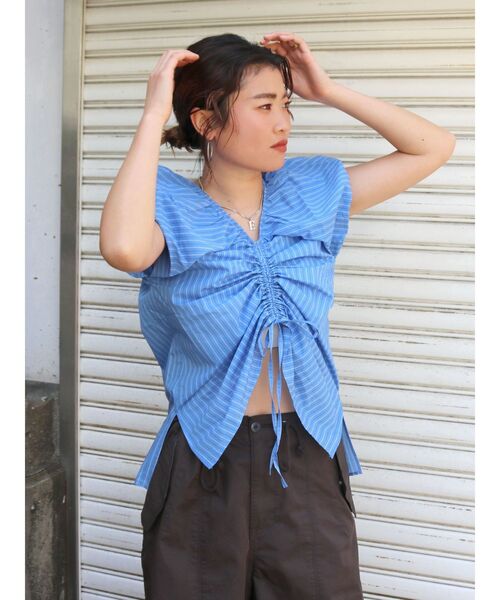 フロントのギャザーがポイントのブラウス ■デザイン ぎゅっと絞って着ていただくことで、ギャザーが寄って動きが出るデザインに。 ショルダー部分にはギャザーを寄せ、フレンチスリーブになるようなパターンに設定に。 二の腕も程よくカバーでき、トレンド感もある1枚です。 Vネックにすることでスタイリングに抜けもでます。 サイドスリットにはスリットをいれており、ギャザーを絞ったときも自然な抜け感がでるようにしています。 ■生地感 薄手のコットン素材。 暑い夏も着ていただきやすい素材感です。 ■サイズ感 ゆとりのあるサイズ感。 肩幅もカバーしてくれるサイズ感です。 ■スタイリング ミリタリーパンツやルーズデニムでカジュアルに合わせたバランスがかわいくおすすめです。 ・・・・・・・・・・・・・・・・・・・・・・ 透け感:なし 裏地:なし 伸縮性:なし 光沢感:なし 生地の厚さ:普通 ・・・・・・・・・・・・・・・・・・・・・・ ※着用画像はフラッシュの加減で実際の製品と色味等が異なる場合がございますので、生地のズームアップ画像をご確認ください。 ※ご利用の端末画面の設定により実際の商品と色味が異なる場合がございます。 ■商品のお気に入り登録 再入荷通知やラスト1点、お得なプライスダウンの情報も受け取ることができます。 ぜひご登録ください◎