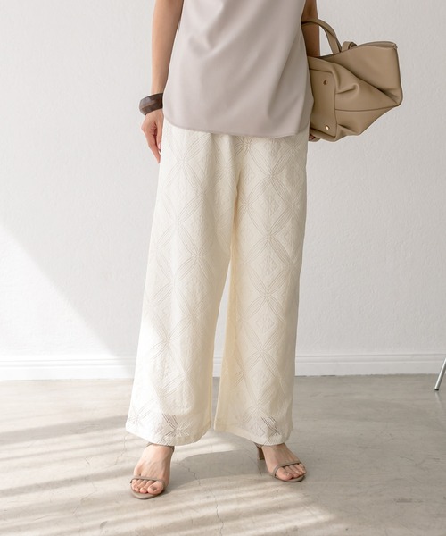 立体的なレース模様がポイントのワイドパンツ ●デザイン 立体的なレース模様がコーデのポイントになるイージーパンツ。 滑らかでややハリのある素材感のため、ナチュラルになりすぎず着ていただけます。 ウエスト部分はゴム仕様になっており、ドロスト付きのためぎゅっと絞って調整していただくことも可能。 シンプルになりがちな春夏のコーデにさり気ない存在感を発揮してくれるアイテムです。 ●おすすめスタイリングアイテム カットジョーゼットフレンチプルオーバー(RDZ1041406A0006) リネンワイドシャツ(RDZ1041204A0003) カップインアメスリタンク(RDZ1041306A0003) ●素材 《表地》 綿 70% ナイロン 30% 《裏地》 ポリエステル 100% ・さらっとした肌触りのいい素材 洗濯方法:手洗い可 透け感:あり 裏地:あり 伸縮性:あり(ウエスト部分) 生地の厚さ:ふつう 光沢:なし ファスナー:なし ポケット:あり -------------------------------------------------------------------------------- 【注意点】 ※画像の商品は光の照射や角度、お使いのモニター環境により、 実物と色味が異なる場合がございます。 ※入荷状況により、お届け予定が前後する場合があります。 ※お客様への発送が店頭販売より遅れる場合もあります。 ※追加生産商品は、一部の店舗、通販で販売中の場合がございます。 予めご了承下さい。 -------------------------------------------------------------------------------- 【お買い物をもっと便利に楽しく♪】 『♡』をクリックでお気に入り登録 ✓「商品のお気に入り登録」で・・・ ラスト1点や再入荷の通知が届きます。登録して頂いた商品だけが対象となる、あなただけのタイムセールが開催されることも! ✓「ブランドのお気に入り登録」で・・・ 新商品や再入荷など、いち早くブランドのお得な情報を 受け取ることができますので、ご登録をおすすめします! --------------------------------------------------------------------------------