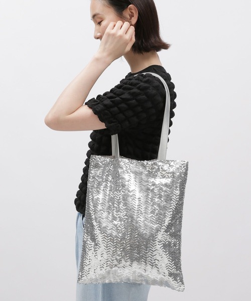 トレンドのスパンコールを使用した、トートバッグ。やわらかく軽い素材感で、A4サイズも収納可能です。長めのハンドルで、肩にかけやすいのも嬉しいポイント。日常使いしやすく、スタリングのアクセントになるアイテムです。
