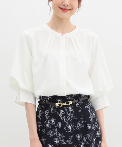 袖コンシャスで華やかに【デザイン】二枚仕立てのふんわりボリューム袖が大人かわいいデザイン。顔回りをすっきり見せるノーカラーと、フロントボタンを隠した比翼仕立てで上品さをプラス。気になる二の腕もカバーできる6分袖。自分にぴったりが見つかる、S~3Lまで揃った豊富なサイズ展開。【素材・機能】落ち感があり着心地抜群の滑らか素材。【スタイル】ジャケットにも合うサイズ感で、テーパードパンツやフレアスカートと合わせたお仕事スタイルと好相性。デニムと合わせてカジュアルダウンさせるのも◎※お客様の声を活かして、L~3Lは肩周りのサイズを着心地が良くなるように改善しました。※6分袖※袖部分のみ二枚仕立て品番:773-63-9786