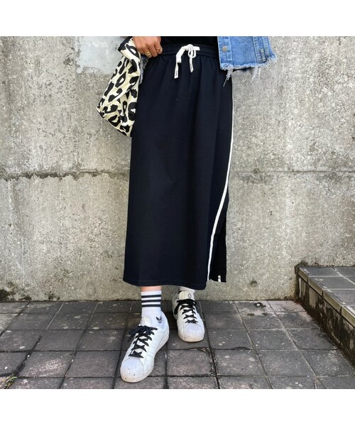 カジュアルなスタイリングにマッチするスウェットスカートが登場! ストンと落ちるシルエットに、片側サイドラインにざっくりスリットが入った大人の抜け感を演出してくれる1枚。 ウエストゴムで伸縮性もあり履き心地も◎ スウェット素材なのでオールシーズン着用できるアイテムです。 ※モデル身長:161cm ▪️カラー ブラック ▪️サイズ M 総丈79cm ウエスト34cm(ゴム) ※多少の誤差は予めご了承ください。 ▪️素材 ポリエステル65% 綿35%