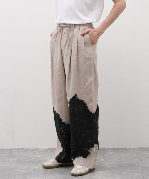 《2024 MARKAWARE × EDIFICE》 MARKAWAREらしく素材に拘り、手染め加工をリクエストしたミニコレクションがリリース! 余裕のある腰回りが特徴の新型「TRIPLE PLEATED WIDE TROUSERS」。 3本のプリーツを施し、裾幅を大きくすることでワイドパンツとして迫力があります。シャツやTシャツをタックインするとプリーツがより際立ちます。ボリューミーなスニーカーからミニマルな革靴まで幅広く合わせられるのも魅力です。 ウェストはゴム入りでドローコードでアジャストするイージー使用で、リラックスした穿き心地も魅力です。 穿くだけでコーディネートにインパクトを与える太さが特徴的な新型ワイドパンツ。 緻密にデザインされたシルエットは、穿くだけでファッション感度を上げてくれます。クラシックとモダンが共存したシルエットが特徴で、裾幅が広く、スニーカーからブーツまで合わせるシューズも幅広いため、気分によってさまざまなコーディネートを楽しめます。まるで雲のようなアーティスティックなデザインは、職人が1点ずつ手で染めています。 別注のTAUPEカラーにブラックが映える仕様です。 ※こちらの商品は手作業で加工している為、1点1点デザインが異なります。 【MARKAWARE / マーカウェア】 2003年に設立された日本のメンズブランド。”大人のための、洗練されたハイエンドガーメントを提案”という位置づけで、日本製のメンズウエアを発信しています。素材選びや、縫製、加工など、洋服作りの全アプローチを国内で行い、古き良き時代から培われてきた職人的ディテールワークに独自のモダニズムを盛り込んだ服作りが特徴。美しいカッティング、装飾の少ないシンプルなデザインが人気を博しています。 【ご注意】 ※照明の関係により、実際よりも色味が違って見える場合があります。 またパソコン・スマートフォンなどの環境により、若干製品と画像のカラーが異なる場合もございます。 ※商品の色味は、商品アップ画像をご参照ください。 モデルサイズ:身長:178cm 着用サイズ:3 本体:手洗い可能