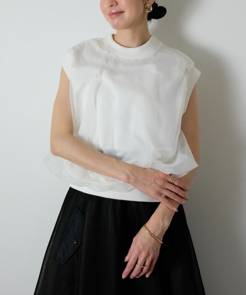 独特なバランス感が魅力のトップス。 ハリのあるオーガンジーでエアリーな立体感を表現し、オーガンジーの下に 綿100%のカットソー生地をレイヤード。 裾をリブで切替え、メリハリのあるスタイルに。 程よくゆとりのある身幅とヒップがすっぽり隠れる丈感に、 フレンチスリーブで気になる二の腕をカバー。 タイトスカートにヒールを合わせたスタイルや、 デニムとスニーカーと合わせたカジュアルスタイルも◎ ジャガードやレースなど大人っぽい素材のアイテム合わせで大人の着こなしに遊び心をプラス。 一枚でお出かけムードを高めてくれるコーデが完成します。 --------------------------------------------------------------------------------------------------------- 【商品特性】 透け感:オフ少しあり 裏地:なし 伸縮性:あり 光沢感:あり 生地の厚さ:普通 --------------------------------------------------------------------------------------------------------- ★商品のお気に入り登録 完売していても再入荷時に再入荷通知を受け取ることができますので、是非ご登録ください☆ ★ブランドのお気に入り登録 新商品や再入荷などの情報を受け取ることができますので、是非ご登録ください☆ ※画像の商品は光の反射や角度により、実物と色味が異なる場合がございます。 また、表示のサイズ感と実物は若干異なる場合もございますので、予めご了承ください。 ※着用、お取り扱いの際は、商品についている品質表示とアテンションタグを必ずご確認ください。
