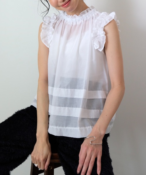 【フリルが際立つ、上品で華やかなブラウス!】 ◼︎design ・トレンドに左右されない定番のフェミニンブラウス。・サラリとしたコットンシルクを使っているので、程よくキチンと感も演出。・ショルダー部分にフリルをあしらっているので、華奢見え効果も◎・首元が程よく詰まった上品なネックラインで、更に女性らしさもプラス。・アクセサリーなしでも顔周りを華やかに仕上げてくれる1枚。・襟元のフリルはギャザーを調節できるリボンデザイン◎・コンパクトなシルエットでそんなボトムスとも相性抜群! ◼︎textile・ナチュラル見えするのに光沢感があり、上品な印象に仕上がるコットンシルクを起用。・柔らかいタッチとナチュラルな光沢感がシルクならではの上品さを演出。・ほんのり透け感もあり涼し気な雰囲気も演出◎ ◼︎styling・Tシャツコーデが多くなりがちなこの季節、大活躍間違いなし!・大人きれいコーデ、カジュアルコーデと幅広く対応でき、デイリーに活躍。・ジャケットと合わせて大人っぽさをプラスするスタイルもおすすめ。・カジュアルなボトムでハズしたり、スカートで女性らしく。---------------------------------------------------------------------------------------------------------【商品特性】透け感:あり裏地:なし伸縮性:なし光沢感:なし生地の厚さ:薄手---------------------------------------------------------------------------------------------------------★商品のお気に入り登録完売していても再入荷時に再入荷通知を受け取ることができますので、是非ご登録ください☆★ブランドのお気に入り登録新商品や再入荷などの情報を受け取ることができますので、是非ご登録ください☆※画像の商品は光の反射や角度により、実物と色味が異なる場合がございます。また、表示のサイズ感と実物は若干異なる場合もございますので、予めご了承ください。※着用、お取り扱いの際は、商品についている品質表示とアテンションタグを必ずご確認ください。