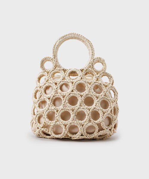 【My style is...掲載】 持つだけで春夏のムードを高めてくれる!スタイリングのポイントになるリングメッシュバッグ ・ペーパーとヤーンを引き揃えて編んだデザインバッグ ・付属の巾着袋付き(本体同色系) ・サークルハンドルが新鮮な印象 ・シーズンムードを高めてくれるアクセントアイテム 【デザイン】 春夏のスタイリングに合わせるだけで一気にシーズンムードを高めてくれるハンドバッグ。 ペーパーとヤーンを引き揃えて手編みした繊細かつリゾート感のあるアイテムです。 付属の巾着が付いているので、荷物の中身が飛び出したり見えたりすることが無いのも嬉しいポイントです。 シンプルなワンピースにあわせてリゾート感を演出したり、デニムなどと合わせるカジュアルスタイリングがおすすめです。 ※照明の関係により、実際よりも色味が違って見える場合があります。また、パソコン・スマートフォンなどの環境により、若干製品と画像のカラーが異なる場合もございます。 店舗へのお問い合わせ商品番号:C71-18065 ●製品寸法: 00:高さ26cm 幅(上部)22cm 幅(下部)28cm マチ6cm 持ち手上がり10cm 付属袋H26.5cm 付属袋W28.5cm 備考:重量:約390g
