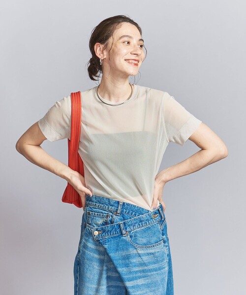 シアー素材をカジュアルに楽しむチュールトップス ■デザイン ライトできれいめなチュール素材を使用した、カジュアルな印象のTシャツ。 トレンド感のあるルックスでありながら、Tシャツやシンプルなブラウス感覚でコーディネートが楽しめる万能トップスです。 ■素材 さらっと薄くて軽いポリエステルチュール素材。 メッシュの穴が小さめなので、透けすぎず、着用しやすい素材感が魅力です。 ■コーディネート ワイドデニムやナイロンカーゴ系のボトムでのカジュアルなスタイルや、柄ボトムとの合わせもおすすめです。 #春服,#夏服 ============================ 裏地:なし 透け感:あり 伸縮:ややあり 光沢感:なし ケア方法:手洗い可・ドライクリーニング ============================ 【注意事項】 ※商品を使用前に、タグ等に記載されている「取り扱い上の注意書き」、「洗濯表示」を必ずご確認ください。 ※商品画像は、光の当たり具合やパソコンなどの閲覧環境により、実際の色味と異なって見える場合がございます。あらかじめご了承ください。 ※商品の色味の目安は、商品単体の画像をご参照ください。 店舗へお問い合わせの際は、全国のBEAUTY&YOUTH各店舗まで下記の品名/品番をお申し付けください。 品名:□BL P/TULLE SSL TEE 品番:16171376065