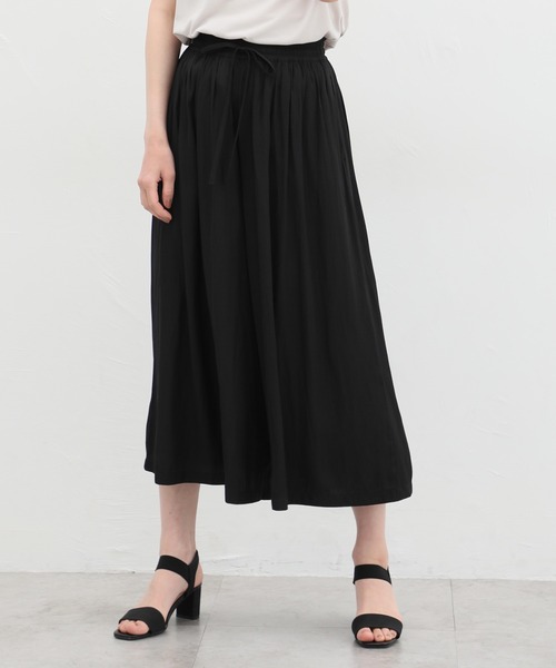 涼しげ素材で快適に【デザイン】やさしい印象の、スカート見えするワイドシルエット。ヒップや太もものラインを拾わず体型もカバー。落ち着いた大人カラーのバリエーション。【素材・機能】やや光沢のある、さらっとしたサテン素材。ウエストゴムでストレスフリーなはき心地。便利な両サイドポケット付き。【スタイル】合わせるトップス次第で、ちょっとしたお出かけからリラックスシーンまで幅広く活躍。※ウエスト部分ゴム品番:585-73-0823