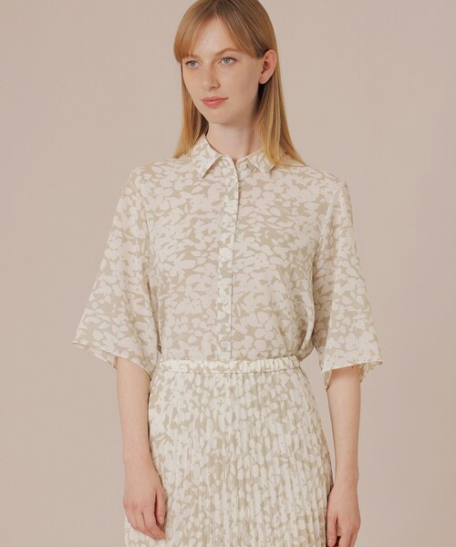 【接触冷感】【ウォッシャブル】【着用推奨シーズン:春・夏】 <素材説明> 強撚のポリエステル糸を使用し、さらっとした表面感とナチュラルなストレッチ性が特徴の素材に、花のシルエット柄をプリントした生地です。 <機能性> 接触冷感(冷感は持続するものではありませんので予めご了承ください。) <デザインポイント> ボクシーなシルエットで抜け感のあるワイドスリーブのシャツブラウスです。ゆったりとしたシルエットの中にシャツカラーとセットインスリーブを取り入れ、きちんと感も演出しています。タックイン・アウトどちらの着こなしもバランス良く合わせていただける着丈です。同素材のスカート(品番:G5S06353)、ワンピース(品番:G5J03353)もご用意しております。 モデル:H173 B78 W60 H87 着用サイズ:38